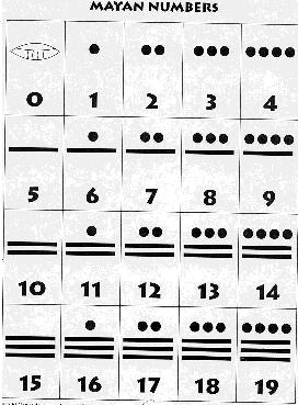 The number system includs lines and dots. A line is five and the dots are ones.For an example two lines is ten four lines is twenty, you get the idea.The Maya were also the first to use zero,the number zero looked like an eye.